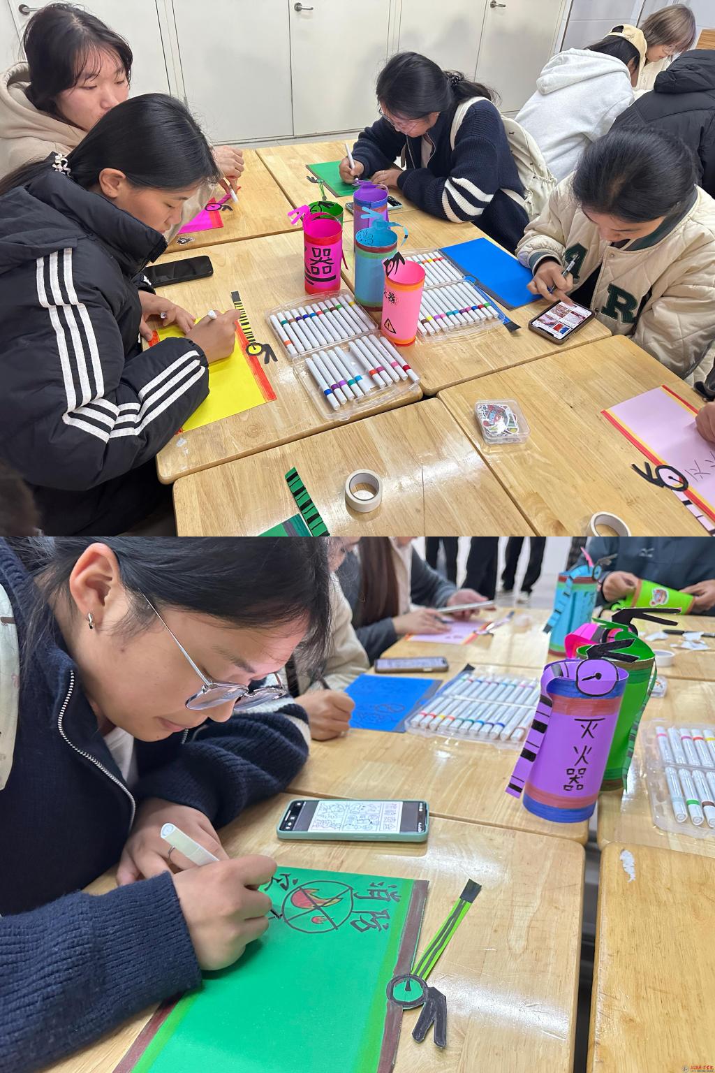 为让消防知识寓教于乐、深化安全意识,11月4日开展消防创意绘画活动,同学们通过制作微型灭火器、设计消防标语及集体合影等环节,让参与者在动手实践中深化安全理念,掌握自救技巧,增强校园安全责任感。