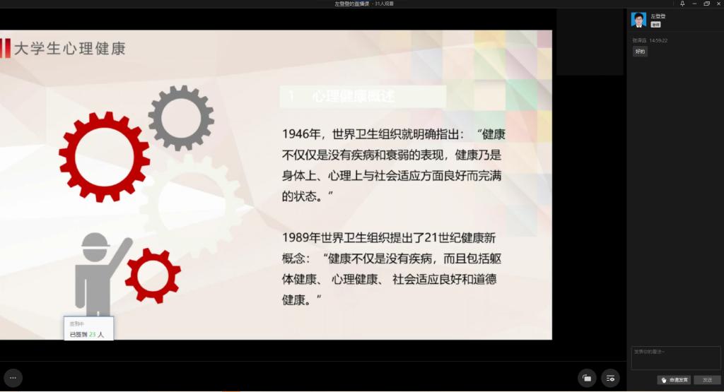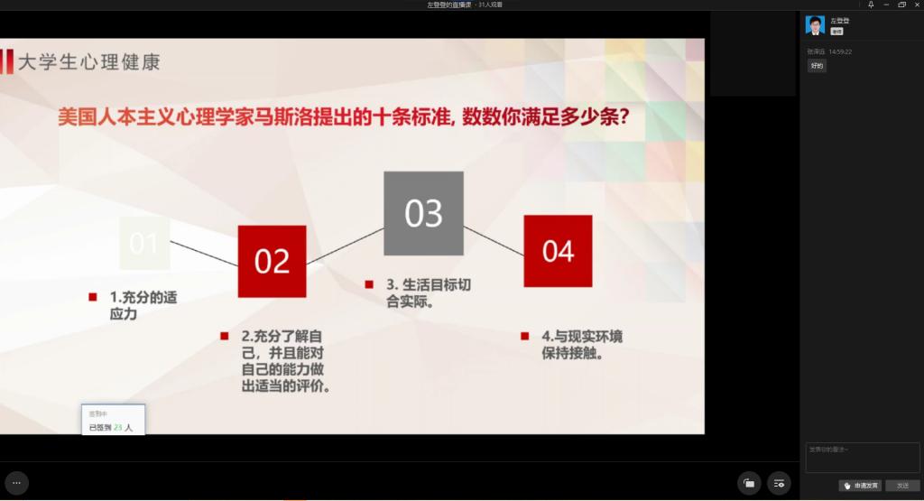 开始时,左登登老师就正视疫情和封校管理、大学生封校常见心理问题以及怎样拥有健康心态和健康身体四个方面进行讲解。在交流中深入了解同学们存在的心理问题,并通过同学们的回答推进会议内容,对同学们存在的心理问题提供解决措施,并意识到封校会给学生的正常学习、生活带来或多或少的不便,因此,学生出现抵制心理属于正常现象,但学生绝大部分都能保持积极乐观的心态,有益于疫情期间大家的生活与学习。同时大部分学生可以比较理性的认识封校的意义。通过讨论了解到:在封校期间,明显的不愉快心情未主导学生心理状态,情绪变化不为显著,学生大多采取电话,网络等方式与外界进行沟通联系,以保持积极心态。