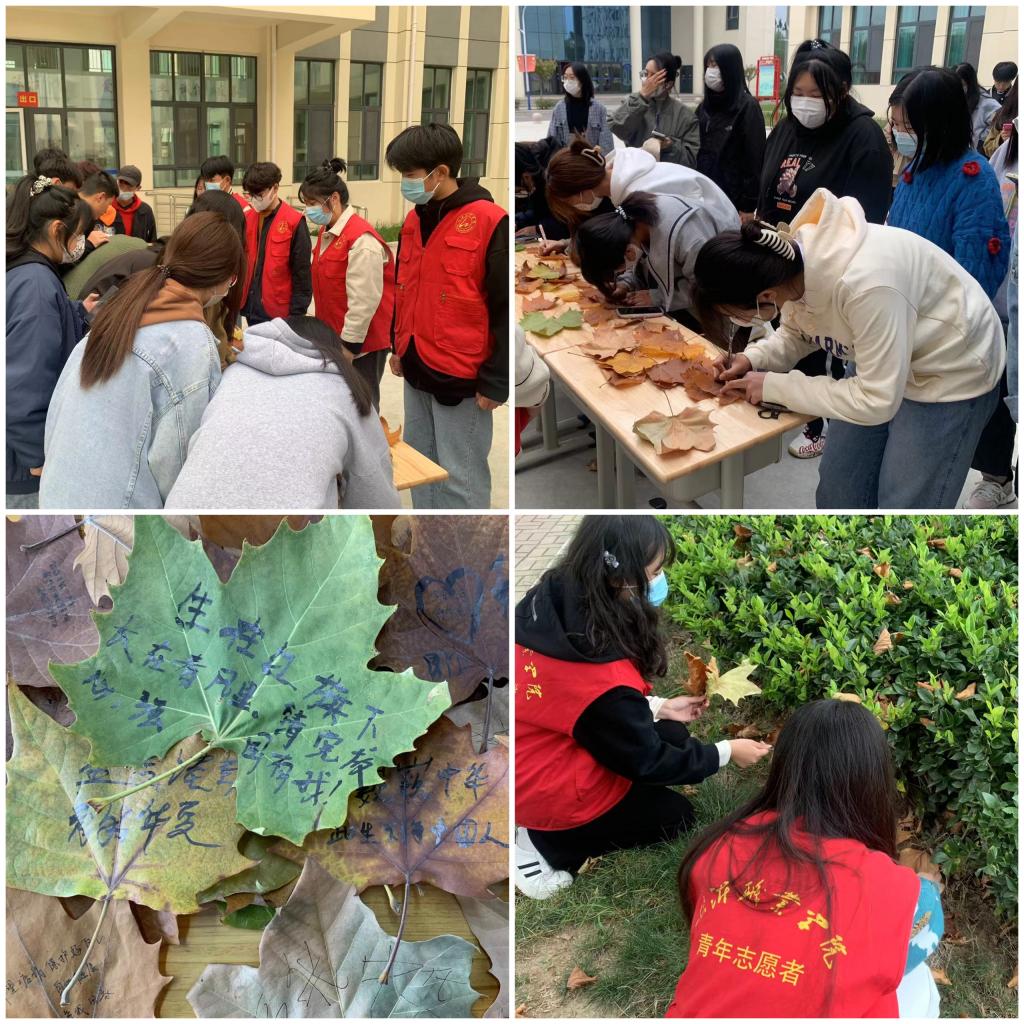 弦动别曲,叶落知秋。为激发同学们爱国、爱党、爱校热情,切实提高同学们的志愿服务意识。10月27日,数字媒体与艺术学院在经开校园内开展“落叶为纸,传递祝福”志愿服务活动。