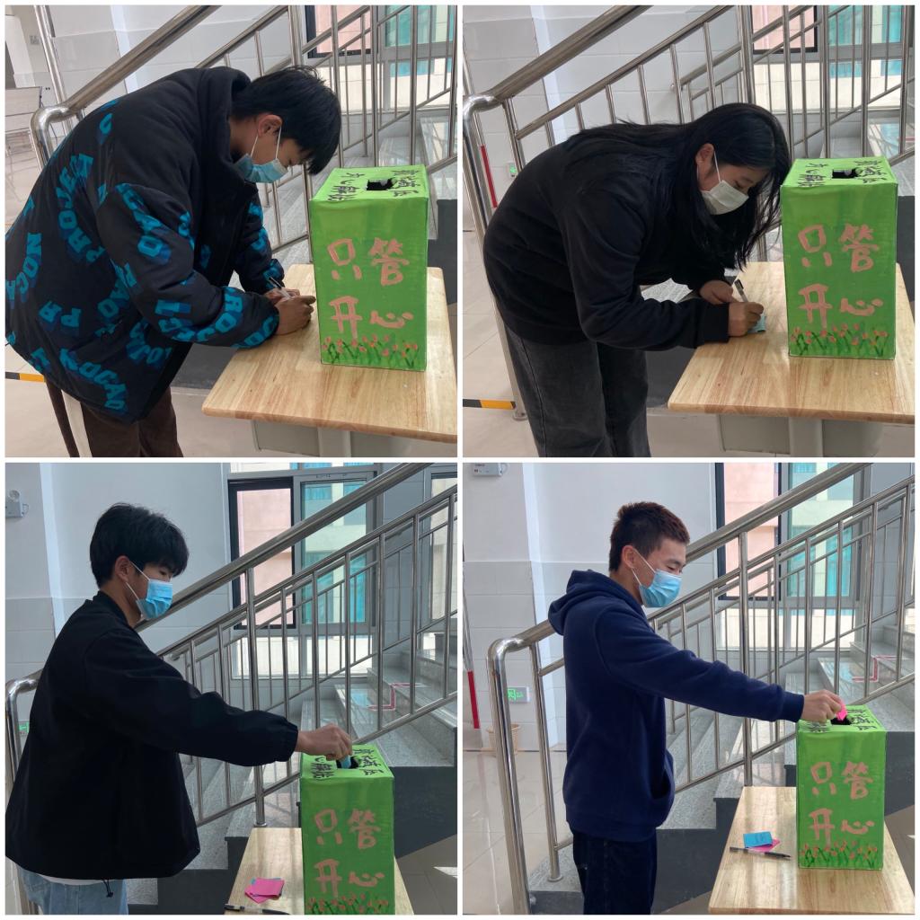 活动开始前,活动负责人先在情绪箱上进行涂鸦,写上鼓励和正能量的话,放在指定位置。“情绪垃圾箱”活动现场,同学们将烦杂、扰人的情绪写在便利贴上,将便利贴扔进“情绪垃圾箱”进行情绪宣泄和压力释放,这引导同学们保持平和的心态,树立积极的信念。