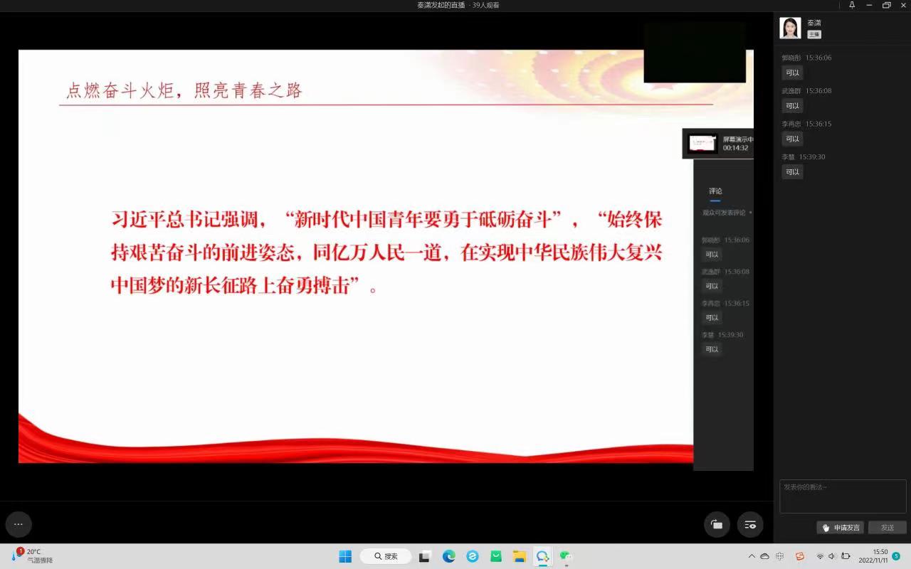为使广大青年深刻认识党的二十大重大意义,让红色基因代代相传、星星火炬永放光芒。2022年11月11日,数字媒体与艺术学院于线上开展“砥砺奋进守初心,青春献礼二十大”主题团课,2021级、2022级团员代表参加。
