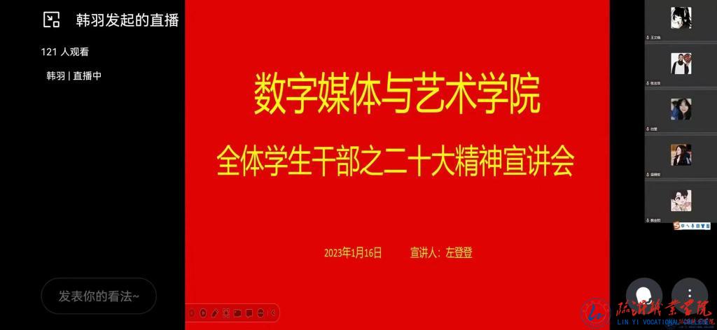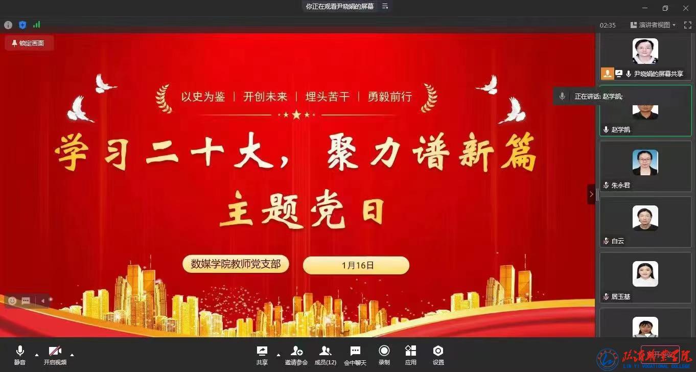 为深入学习贯彻党的二十大精神,数字媒体与艺术学院于1月16日开展“学习二十大,聚力谱新篇”主题宣讲活动,党总支书记主讲,全体师生党员和入党积极分子线上参会。
