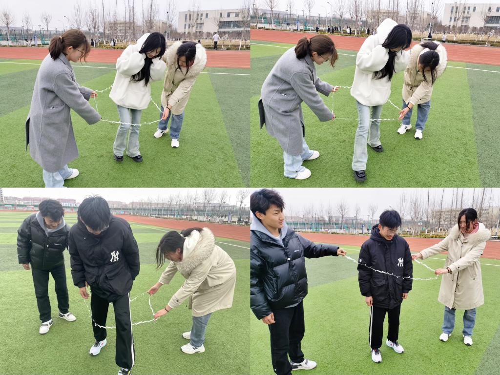 游戏中参与者分为五队,每组携带一张A4纸,将其撕成大圈,小队所有成员必须钻过纸张且纸条不能断,用时最短小队获胜。同学们争分夺秒,互相配合,充分体现了团结友爱,拼搏互助的精神。