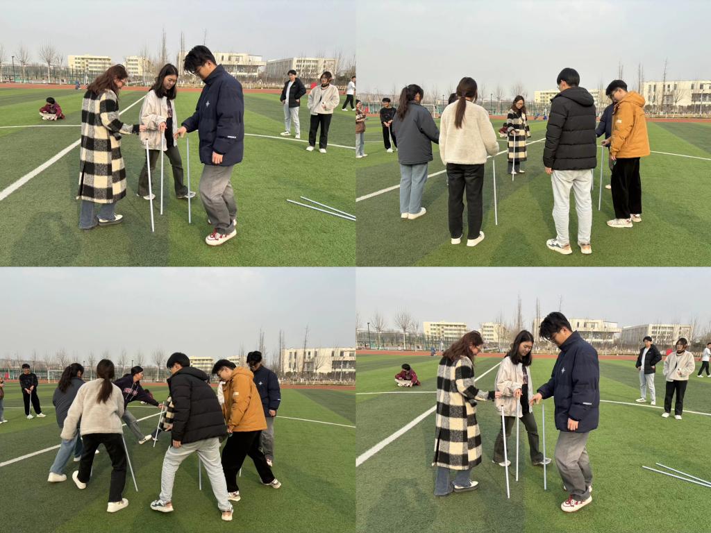 独木难支,二木成林,三木即为森。活动开始,随着一声号令,人手一杆,围成圆圈,他们聚精会神,伸出手,踏着节奏,快速的移动步伐完成交接。同学们协调配合,共同努力组成蕴含巨大能量的不倒森林。
