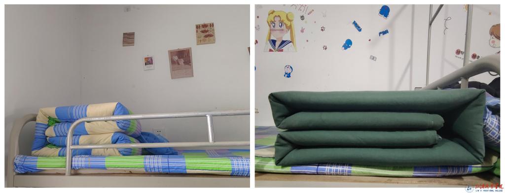 活动中,各班参赛选手熟练地运用军训期间所学的“压、折、挤、掏”等基本动作,有秩序地进行抖整被、叠方块、提棱角,在规定时间内熟练地完成了从棉被到“豆腐块”的改造。