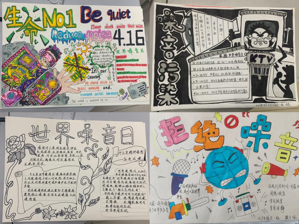 4月17日,各班班长从科学角度为解释噪音对人体健康和生活环境的负面影响,引导学生发挥想象力,运用色彩、线条和图案,将噪音污染的严重性、噪音治理的重要性进行描绘,传播噪音治理理念。