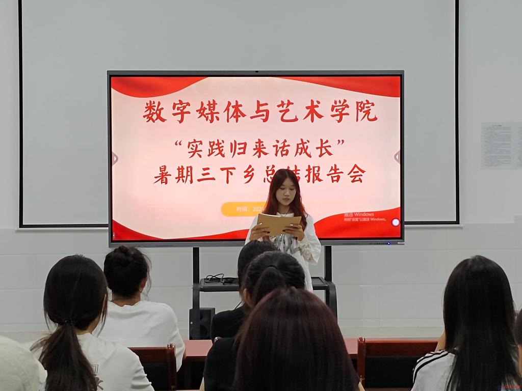 为宣传展示学院青年学生2024年暑期“三下乡”实践风采,进一步巩固扩大社会实践活动成效,9月9日,数字媒体与艺术学院于208会议室开展“实践归来话成长”暑期三下乡总结报告会,三下乡团队成员参加。