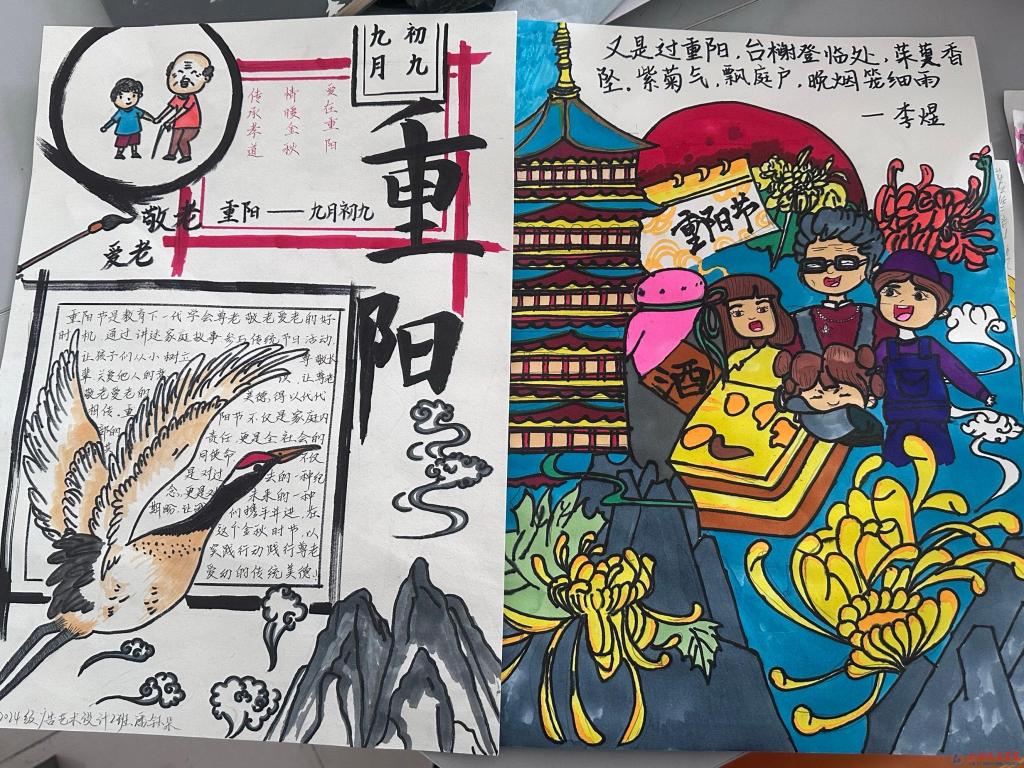 学生积极响应,围绕重阳节敬老孝亲主题,拿起画笔,制作个性化的手抄报,将自己对传统文化的理解、对老年人的尊敬以及对家庭亲情的感悟融入其中。每一幅作品都充满了创意与情感,展现了同学们深厚的艺术功底和对传统文化的热爱。
