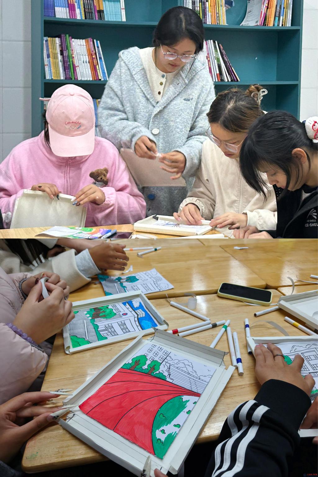 在校园风景绘画环节,学院准备了多幅校园场景线稿,同学们选取心仪的图样后,运用马克笔、水彩笔等进行创作。大家不仅完成了基础填色,更发挥创意加入个性化元素,使每幅作品都成为独特的校园记忆载体。